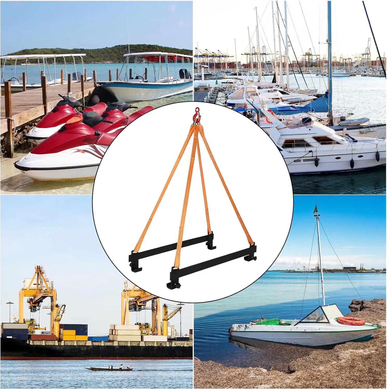 EASY TO USE: The capacity jet ski lift sling simply attaches the steel ring of the sling to the engine crane or lift and then places the rubber coated side bar under the side bumper of the jet ski.